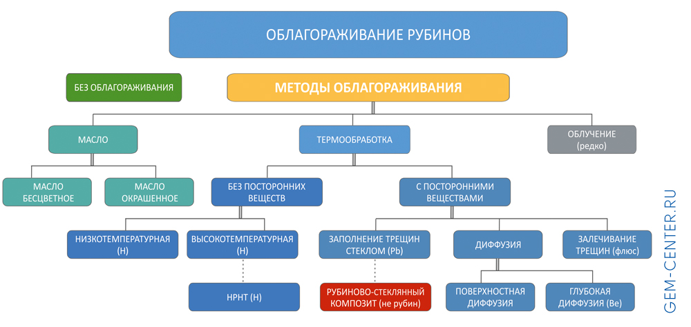 При всём разнообразии терминологии и подходов лабораторий можно говорить о существовании нескольких основных методов облагораживания рубинов, с которыми согласны все. Некоторые лаборатории указывают и другие методы, которые на практике распространены меньше. Различаются также степень детализации информации об облагораживании, применяемые коды и объём пояснений. На рисунке 7 мы свели различные методы облагораживания рубинов (как наиболее распространенные, так и достаточно редкие) в единую блок-схему.
