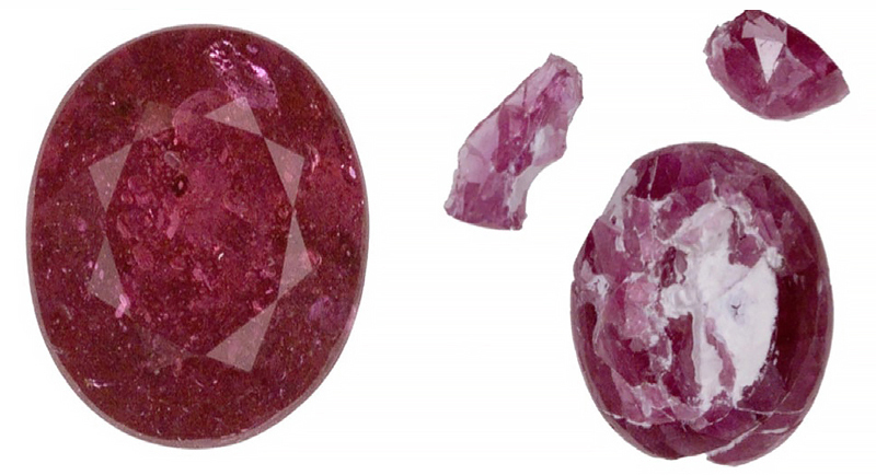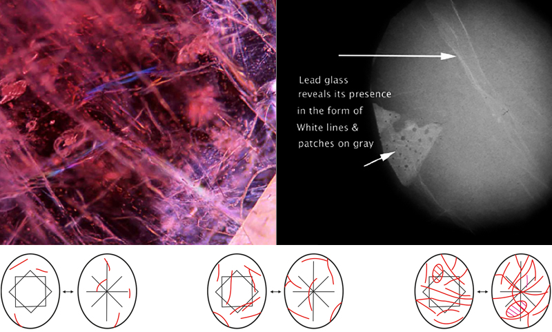 Рис. 3 (снизу). Градации степени заполнения рубина свинцовым стеклом в зависимости от общего числа заполненных трещин в камне (по материалам LMHC): малая степень (слева), средняя степень (в центре) и значительная степень заполнения (справа)