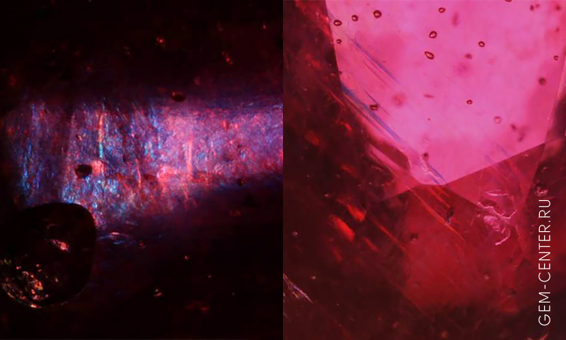Рис. 6. Флэш-эффект голубого, сине-фиолетового цвета в природных рубинах, заполненных свинцовым стеклом