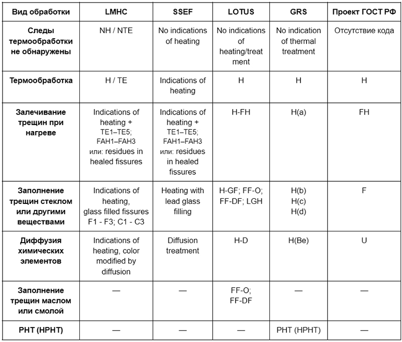 В экспертных заключениях, помимо словесного описания облагораживания, приводятся коды облагораживания. В ряде случаев эти коды аналогичны, в других - различаются у разных лабораторий (см. таблицу №1). Отметим при этом, что в отношении рубинов коды облагораживания во многом существенно отличаются от обозначений, применяемых стандартами CIBJO к другим камням.