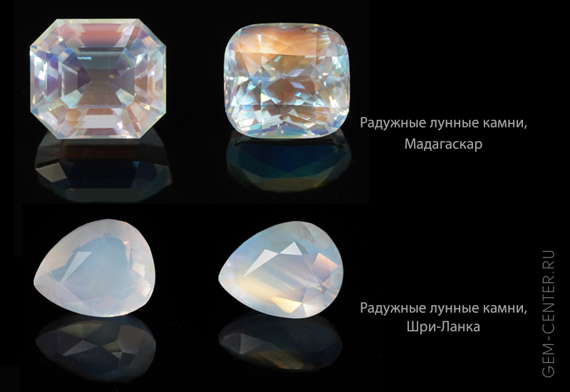 Радужные лунные камни с Мадагаскара, проявляющие радужный эффект, отличаются от традиционных лунных камней не только по внешнему виду, но и по химическому составу. Формально радужный лунный камень не является лунным камнем, поскольку относится к группе плагиоклазов (лабрадор), но на рынке драгоценных камней к образцам такого внешнего вида, прижилось название радужных, или "rainbow moonstone", и они вне зависимости от названия пользуются высоким спросом.