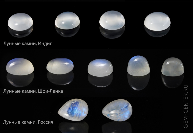 Цвета люминесценции лунных камней со Шри-Ланки согласуются с цветами радужных лунных камней с Мадагаскара, однако при длине волны 365 нм может проявляться желтая люминесценция отдельных зон или структур минерала. Лунные камни из Индии при длине волны 225 нм цвета люминесценции варьируют от голубого до фиолетового, интенсивность люминесценции низкая, однако при длине волны 225 нм отмечается и сильная люминесценция с практически белым цветом. При длине волны 254 нм редко проявляется фиолетовая люминесценция. Лунные камни из России (лабрадор) проявляют те же цвета люминесценции, что и мадагаскарские радужные лунные камни.