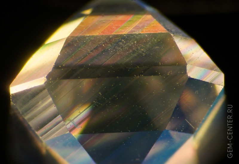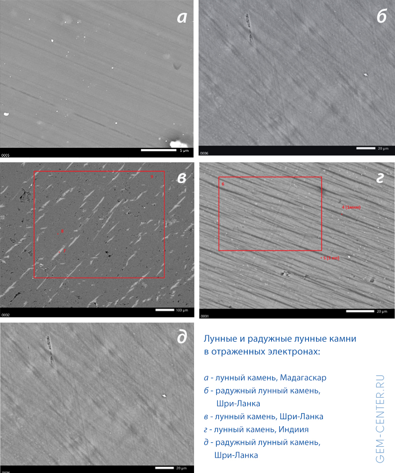 эффект. На микроуровне мы можем наблюдать в этих камнях полисинтетическое двойникование, не характерное для обычного адуляра. Такие образцы можно отличить от лунных камней с помощью рамановской спектроскопии. В качестве типоморфного признака можно выделить сочетание элементов-примесей, определяемых методом LA-ICP-MS, однако на данный момент нет возможности определять месторождение этих камней, поскольку нет достаточных данных о геологии месторождений радужных лунных камней.