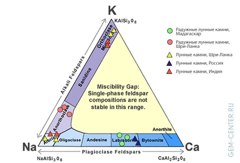 Исследуемые полевые шпаты различаются по содержанию калия, натрия и кальция. В то время как классические лунные камни являются двухкомпонентными K-Na полевыми шпатами, радужные лунные камни являются чистыми плагиоклазами. На рис. 6. представлены положение образцов на диаграмме полевых шпатов – радужных лунных камней с Мадагаскара, Шри-Ланки, лунных камней из России и составы сосуществующих фаз (альбит и ортоклаз) лунных камней из Шри-Ланки и Индии.