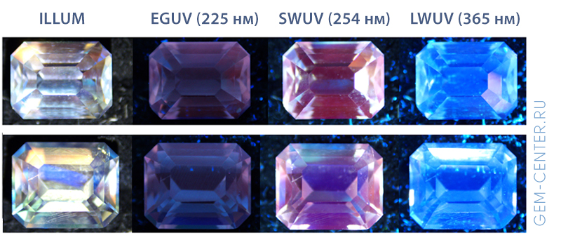 Рис. 6. Характерные цвета люминесценции для радужных лунных камней с Мадагаскара. ILLUM – естественное освещение, EGUV – 225 нм, SWUV – 254 нм, LWUV – 365 нм. Ширина поля зрения 6 см.