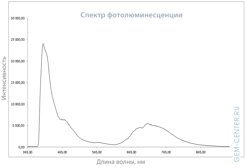 Рис. 7. Спектр фотолюминесценции радужного лунного камня с Мадагаскара, полученный на приборе Aurora Diamond Inspector S1 при комнатной температуре с длиной волны возбуждения 365 нм.